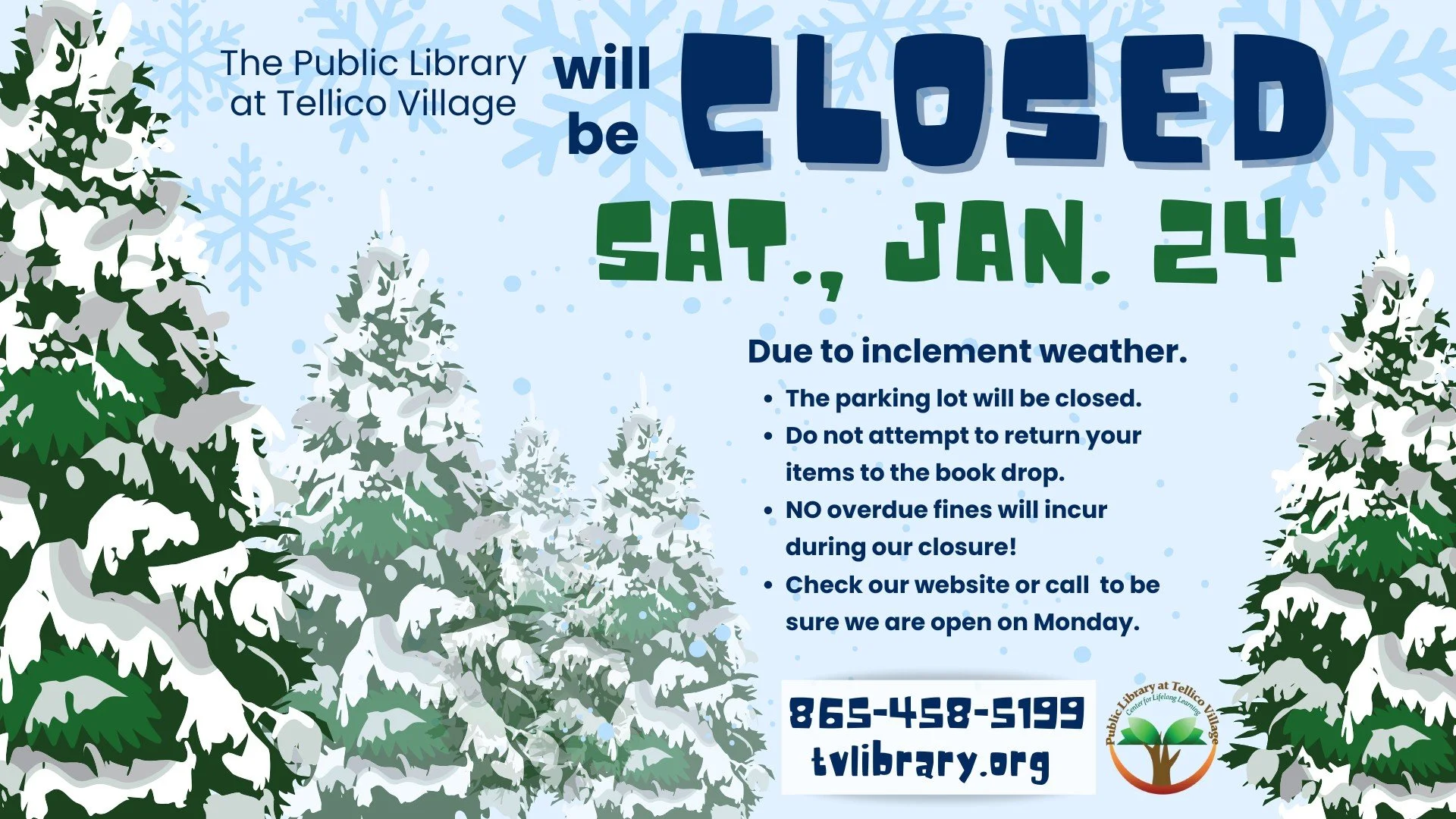 The library will remain closed today due to icy roads. We will continue to monitor the roadways before making the decision to open on Tuesday. Your overdue items wil not incur any fines. Our parking lot will be closed, please do not drop items in the bookdrop.